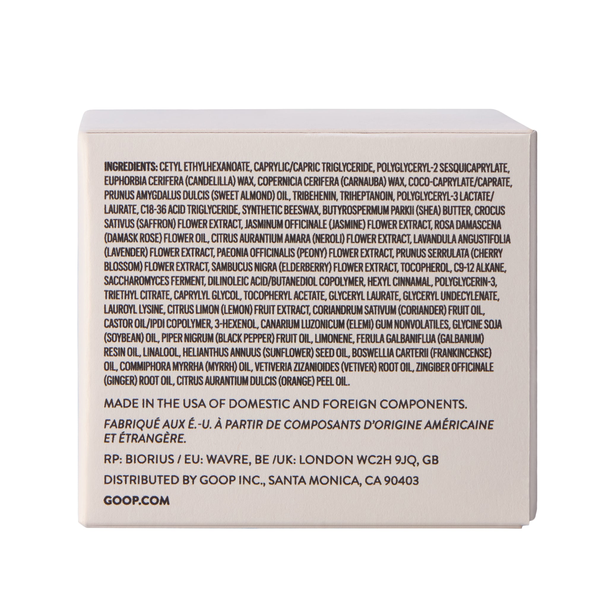 CETYL ETHYLHEXANOATE, CAPRYLIC/CAPRIC TRIGLYCERIDE, POLYGLYCERYL-2 SESQUICAPRYLATE, EUPHORBIA CERIFERA (CANDELILLA) WAX, COPERNICIA CERIFERA (CARNAUBA) WAX, COCO-CAPRYLATE/CAPRATE, PRUNUS AMYGDALUS DULCIS (SWEET ALMOND) OIL, TRIBEHENIN, TRIHEPTANOIN, POLYGLYCERYL-3 LACTATE/LAURATE, C18-36 ACID TRIGLYCERIDE, SYNTHETIC BEESWAX, BUTYROSPERMUM PARKII (SHEA) BUTTER, CROCUS SATIVUS (SAFFRON) FLOWER EXTRACT, JASMINUM OFFICINALE (JASMINE) FLOWER EXTRACT, ROSA DAMASCENA (DAMASK ROSE) FLOWER OIL, CITRUS AURANTIUM AMARA (NEROLI) FLOWER EXTRACT, LAVANDULA ANGUSTIFOLIA (LAVENDER) FLOWER EXTRACT, PAEONIA OFFICINALIS (PEONY) FLOWER EXTRACT, PRUNUS SERRULATA (CHERRY BLOSSOM) FLOWER EXTRACT, SAMBUCUS NIGRA (ELDERBERRY) FLOWER EXTRACT, TOCOPHEROL, C9-12 ALKANE, SACCHAROMYCES FERMENT, DILINOLEIC ACID/BUTANEDIOL COPOLYMER, HEXYL CINNAMAL, POLYGLYCERIN-3, TRIETHYL CITRATE, CAPRYLYL GLYCOL, TOCOPHERYL ACETATE, GLYCERYL LAURATE, GLYCERYL UNDECYLENATE, LAUROYL LYSINE, CITRUS LIMON (LEMON) FRUIT EXTRACT, CORIANDRUM SATIVUM (CORIANDER) FRUIT OIL, CASTOR OIL/IPDI COPOLYMER, 3-HEXENOL, CANARIUM LUZONICUM (ELEMI) GUM NONVOLATILES, GLYCINE SOJA (SOYBEAN) OIL, PIPER NIGRUM (BLACK PEPPER) FRUIT OIL, LIMONENE, FERULA GALBANIFLUA (GALBANUM) RESIN OIL, LINALOOL, HELIANTHUS ANNUUS (SUNFLOWER) SEED OIL, BOSWELLIA CARTERI (FRANKINCENSE) OIL, COMMIPHORA MYRRHA (MYRRH) OIL, VETIVERIA ZIZANIOIDES (VETIVER) ROOT OIL, ZINGIBER OFFICINALE (GINGER) ROOT OIL, CITRUS AURANTIUM DULCIS (ORANGE) PEEL OIL.