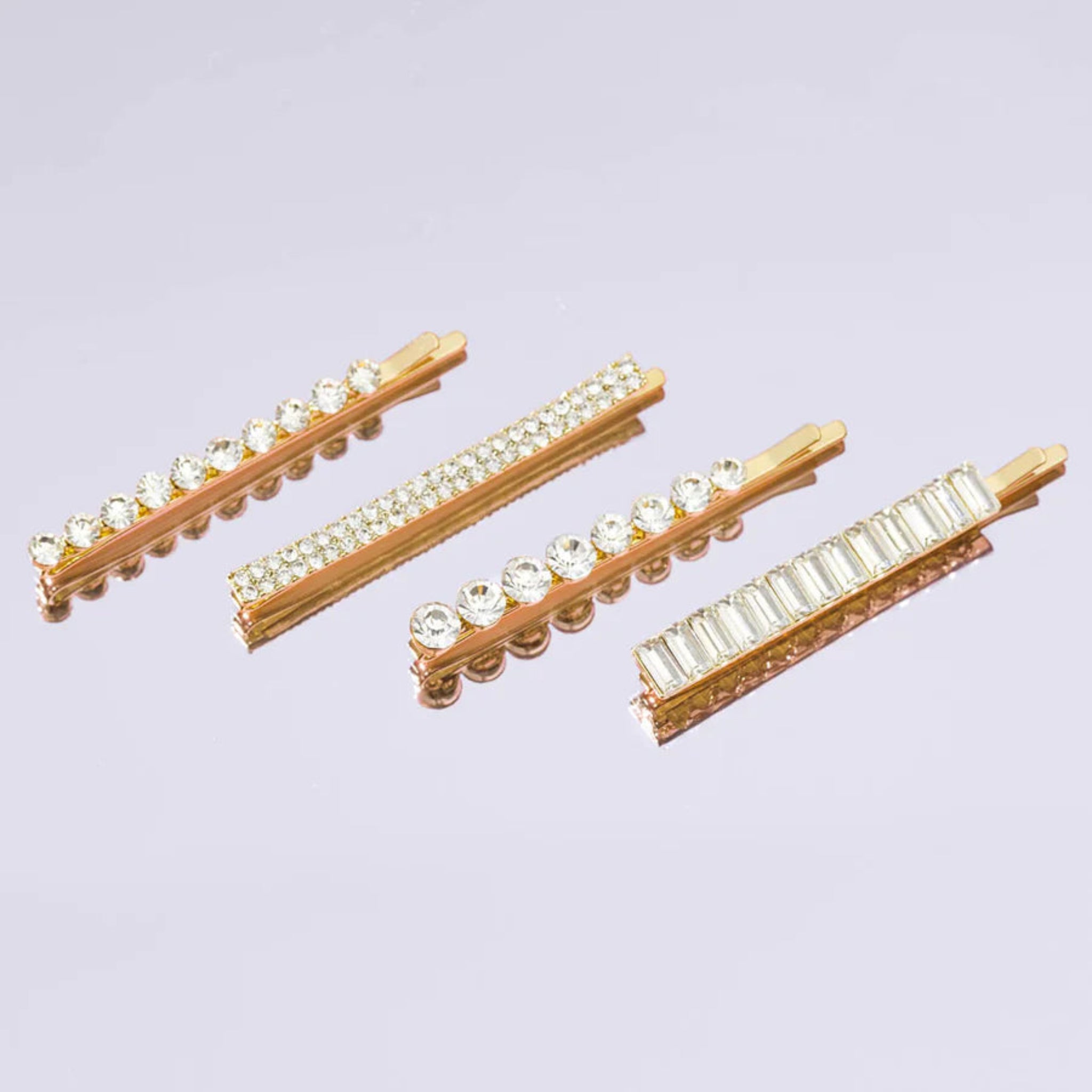 - Set of 4 gold bobby pins with assorted rhinestone shapes