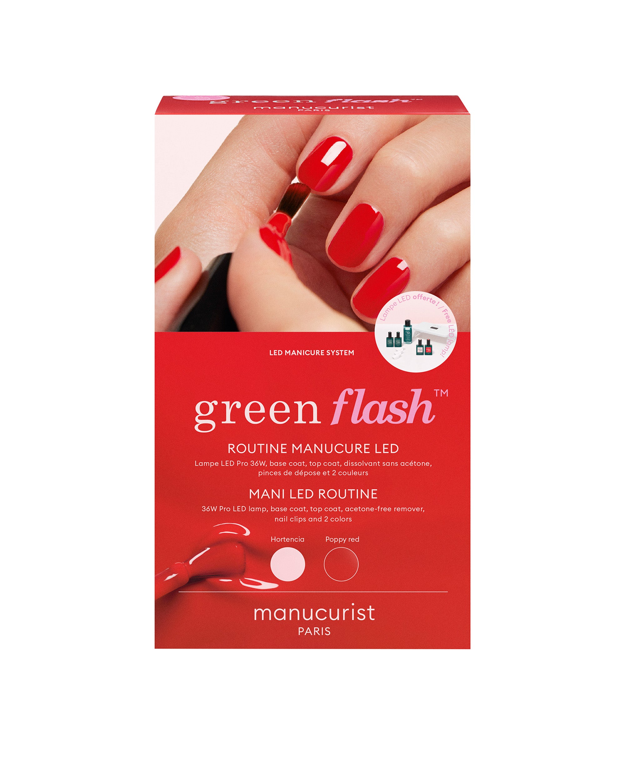 Featuring a base coat, a top coat, remover, nail clips, an LED travel lamp and two colors: Hortencia & Poppy Red , it's the set your hands have been dreaming of!