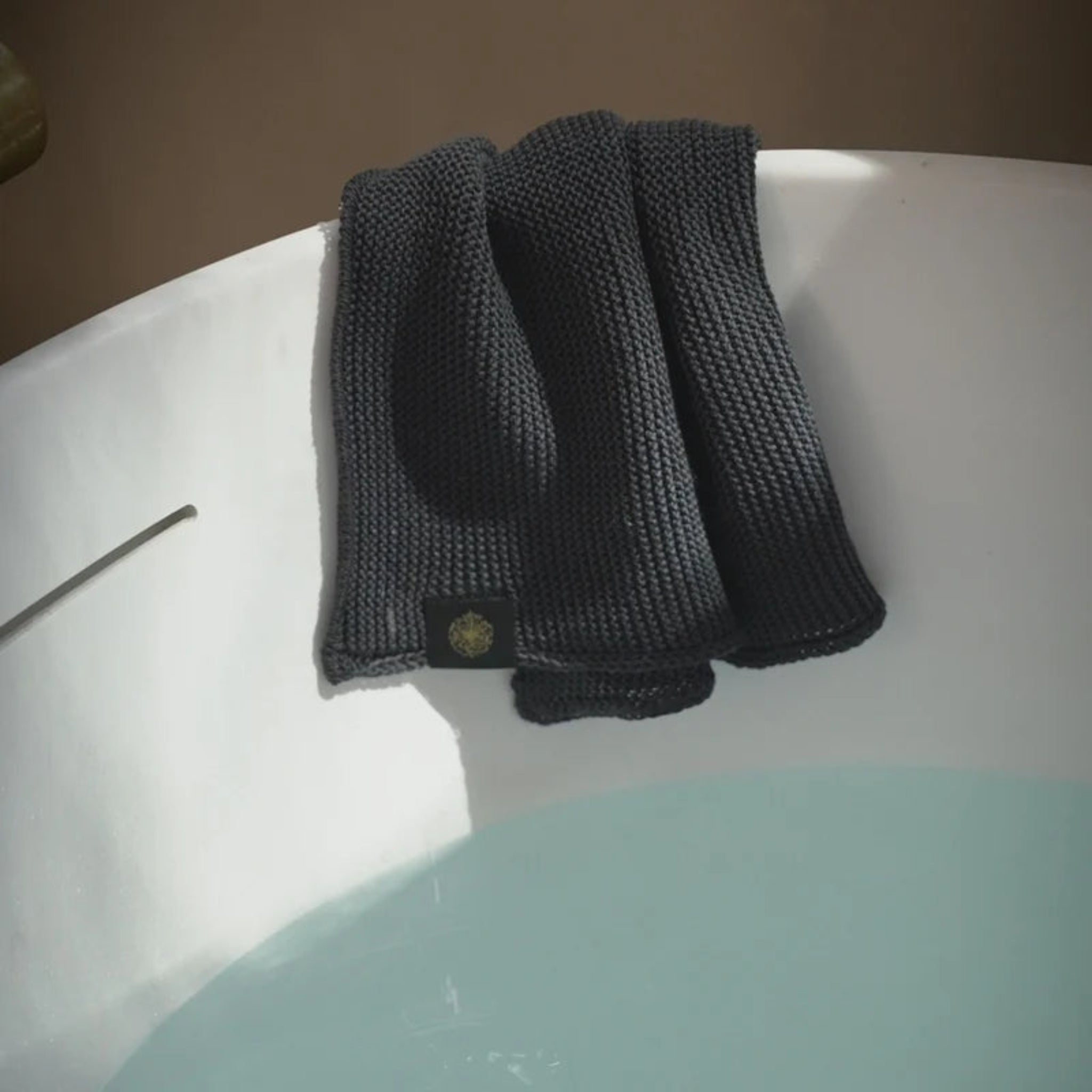 And if you’re in the bath - twist into a long roll to exfoliate the back, shoulders, hips, and thighs. Finally, drape over your chest and belly, soothing stressed nerves as you soak and release.
