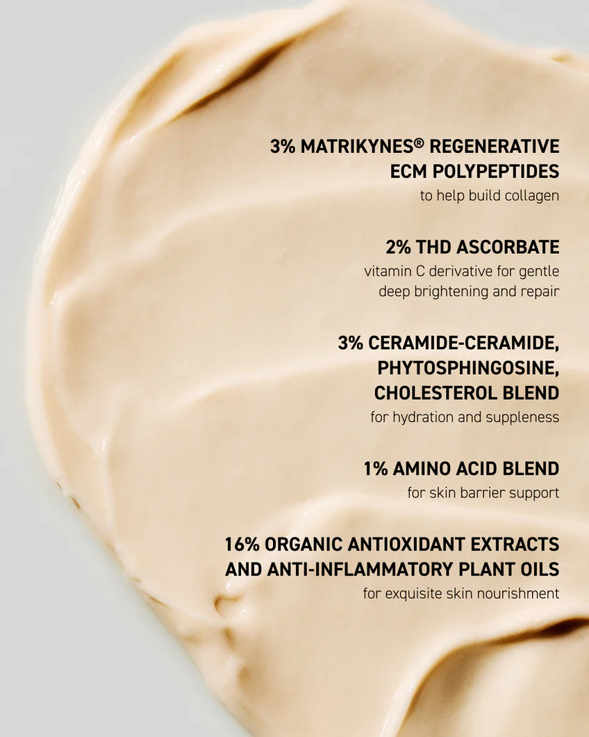 Palmitoyl Hexapeptide-52, Palmitoyl Tetrapeptide-50, Heptapeptide-15, Palmitoyl Heptapeptide-18, Palmitoyl Pentapeptide-4, Copper Palmitoyl Heptapeptide-14, Copper Lysinate/Prolinate, Lactic Acid/Glycolic Acid Copolymer, Ceramide EOP, Ceramide AP, Ceramide NP, Phytosphingosine, Cholesterol, Colloidal Oatmeal, Sodium Hyaluronate, Sodium Hyaluronate Crosspolymer, Hydrolyzed Sodium Hyaluronate, Sodium Acetylated Hyaluronate, Beta-Glucan, Panthenol, Sodium PCA, Sodium Lactate, PCA, Pentylene Glycol, Arginine, Aspartic Acid, Glycine, Alanine, Serine, Valine, Histidine, Phenylalanine, Isoleucine, Proline, Threonine, Thioctic Acid, Ubiquinone, Resveratrol, Tocopheryl Acetate, Bisabolol, Allantoin, Lactobacillus Ferment, Maltodextrin, C12-15 Alkyl Benzoate, Methylglucoside Phosphate, Biosaccharide Gum-1, Sodium Stearoyl Glutamate, Sodium Lauroyl Lactylate, Polyacrylate Crosspolymer-6, 1,2-Hexanediol, Xanthan Gum, Carbomer, Polyvinyl Alcohol, Propanediol, Trisodium Ethylenediamine Disuccinate, Phenoxyethanol, Ethylhexylglycerin, Caprylyl Glycol